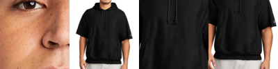 Made for layering, this moisture-wicking hoodie has trend-right short sleeves for more mobility. 5.5-ounce, 100% polyester Anti-static Tag-free label Three-panel hood No drawcords at hood Taped neck Self-fabric hem Front pouch pocket
