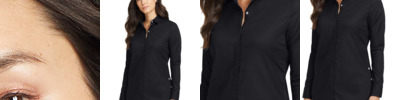 The go-to shirt for her designed for mobility and stretch without sacrificing the iconic OGIO aesthetic. 3.8-ounce, 56/38/6 cotton/poly/spandex Mitered woven label Covered center-front placket with two pearlized buttons at the top Seam sleeve panels with top stitching Button-through sleeve plackets Two-button adjustable cuffs Side vents with pearlized buttons Rounded shirttail hem Woven OGIO badge at front hem Tunic length