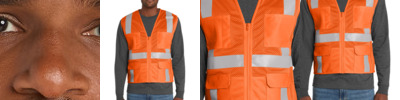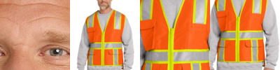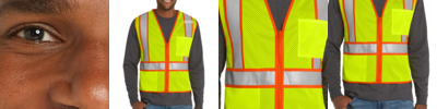 Built for surveyors or anyone who needs the highest ANSI visibility, this breathable, comfortable two-tone vest has short sleeves to meet ANSI 107 Class 3 requirements. 100% polyester mesh for breathability 100% polyester tricot exterior pockets for durability and easy decoration Durable, reflective 2-inch tape meets ANSI 107 requirements and provides 360-degree visibility on body and sleeves Two-tone contrast polyester tricot fabric under reflective tape; contrast binding Left chest bellows pocket with flap and hook and loop closure Two layered right chest pockets: one open, one divided Two lower front flap pockets with hook and loop closures Interior open lower mesh pockets on both sides Mic clip at left chest for easy access Molded center front zippered closure This garment must be fully zipped to be in compliance with ANSI 107 standards
