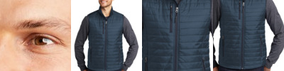 Staying warm while on the go has never been easier with our Packable Puffy Vests. Thanks to a water-repellent fabric coating and finish, you'll remain comfortable no matter where your day takes you. 100% polyester shell and lining 2.4-ounce, 100% polyfill insulation Interior storm flap with chin guard Reverse coil zippers Zippered chest pocket Front zippered pockets with rubber-wrapped zipper pulls Adjustable locking drawcord at hem Port Pocket for decoration access Dyed-to-match drawstring carrying pouch included