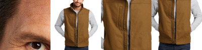 Soft shell technology meets durable duck cloth in this hardworking, water-resistant vest that has an ultra-warm fleece interior. 100% cotton canvas shell with a DWR finish bonded to a water-resistant film insert and 100% polyester microfleece lining Metal front zipper Zippered chest pocket Zippered hand pockets Three interior pockets